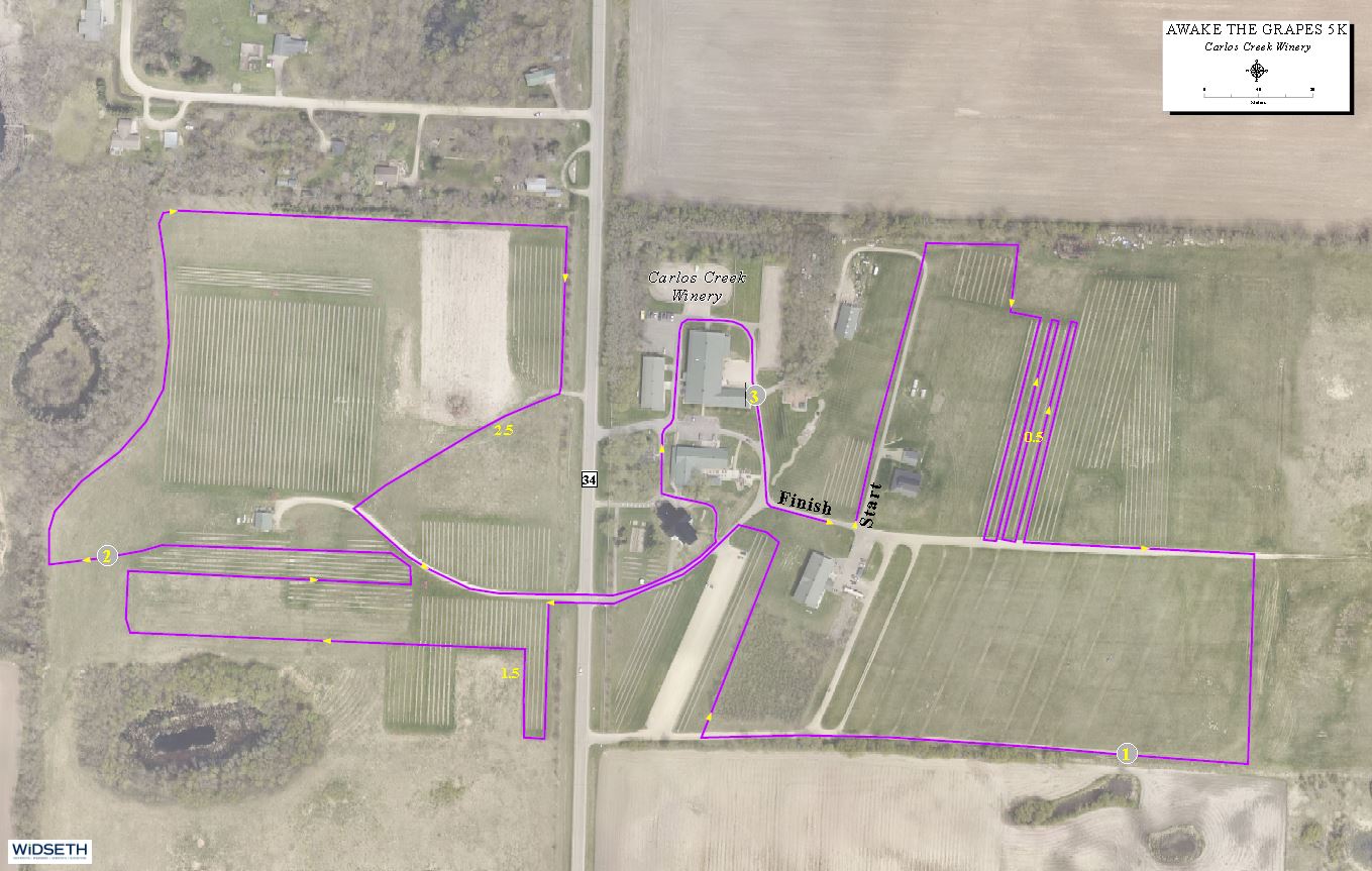 The Awake the Grapes 10K course will lead runners on a picturesque race through the Carlos Creek Winery vineyards, out to County Road 34, along the east side of Lake Ida, east on County Road 61 to County Road 34 and back to Carlos Creek Winery.